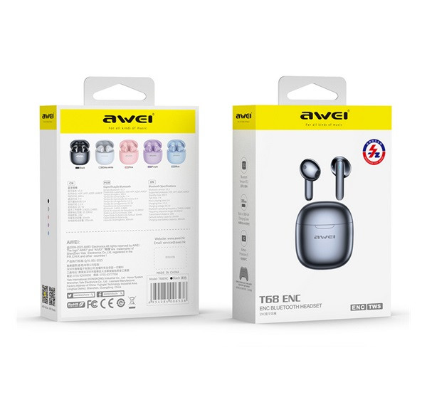 AWEI T68 bluetooth fülhallgató SZTEREO (v5.3, TWS, zajszűrő, mikrofon, IPX6 + töltőtok) FEKETE