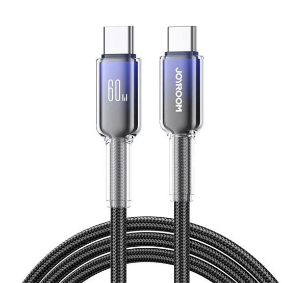 JOYROOM CRYSTAL-CLEAR adatkábel (Type-C - Type-C, 60W, gyorstöltő, cipőfűző, 120cm) FEKETE