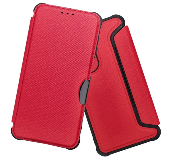 Tok álló, bőr hatású (FLIP, oldalra nyíló, ütésállóság, légpárnás sarok, kameravédő, karbon minta) PIROS