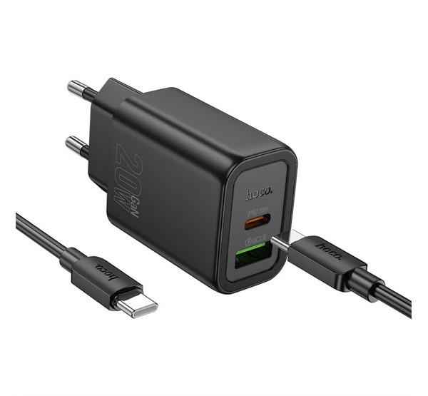 HOCO N61 hálózati töltő USB+Type-C aljzat (20W, PD gyorstöltő 3.0 + Type-C kábel) FEKETE