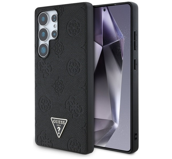 GUESS GRAINED HOT STAMP PEONY PATTERN szilikon telefonvédő (ütésállóság, bőr hatású hátlap, MagSafe) FEKETE