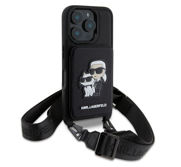 KARL LAGERFELD SAFFIANO CROSSBODY STRAP szilikon telefonvédő (ütésállóság, nyakpánt, kártyatartó) FEKETE