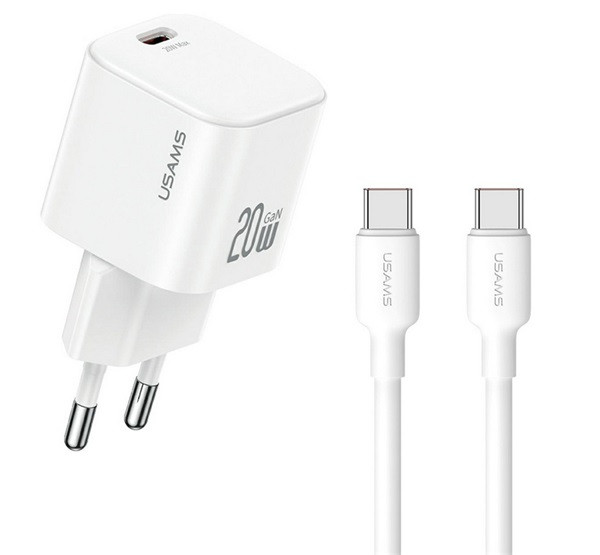 USAMS JO hálózati töltő Type-C aljzat (20W, PD gyorstöltő + Type-C kábel) FEHÉR