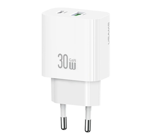 USAMS T65 hálózati töltő USB+Type-C aljzat (30W, PD gyorstöltő) FEHÉR