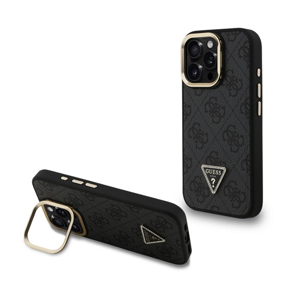 GUESS PU 4G STRASS TRIANGLE LOGO STAND műanyag telefonvédő (ütésállóság, bőr hatású hátlap, kitámasztó) FEKETE