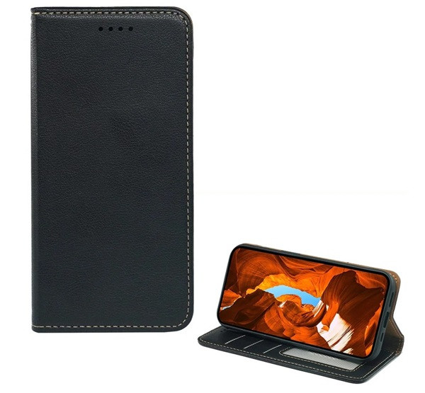 Tok álló, bőr hatású (FLIP, oldalra nyíló, asztali tartó, RFID, prémium) FEKETE