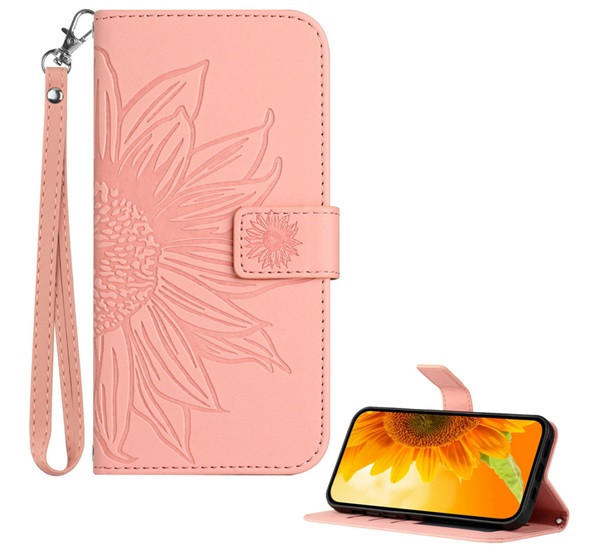 Tok álló, bőr hatású (FLIP, oldalra nyíló, asztali tartó, bankkártya tartó + kézpánt, napraforgó minta) RÓZSASZÍN