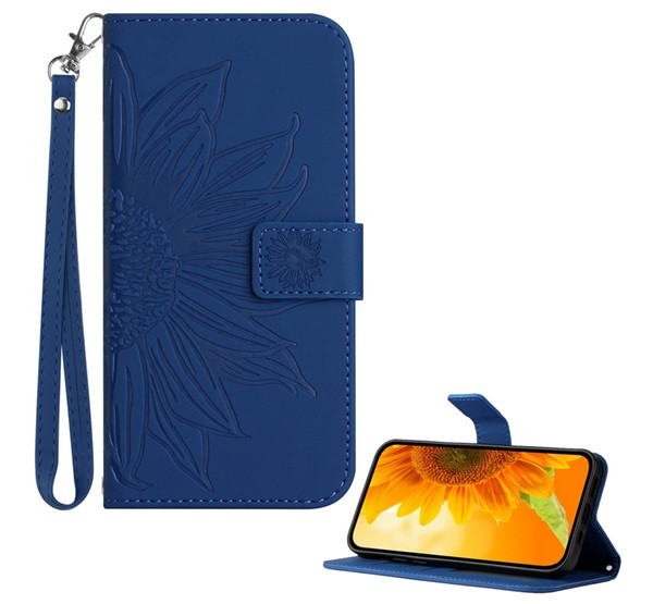 Tok álló, bőr hatású (FLIP, oldalra nyíló, asztali tartó, bankkártya tartó + kézpánt, napraforgó minta) VILÁGOSKÉK