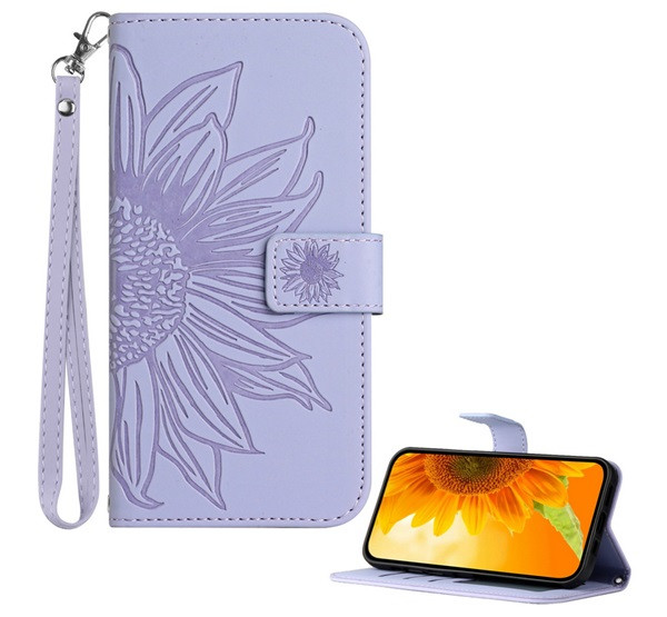 Tok álló, bőr hatású (FLIP, oldalra nyíló, asztali tartó, bankkártya tartó + kézpánt, napraforgó minta) VILÁGOSLILA