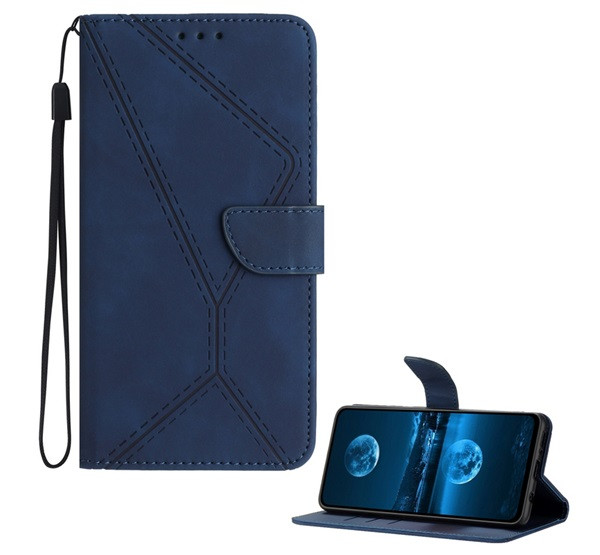 Tok álló, bőr hatású (FLIP, oldalra nyíló, asztali tartó, bankkártya tartó, varrás minta + kézpánt) SÖTÉTKÉK