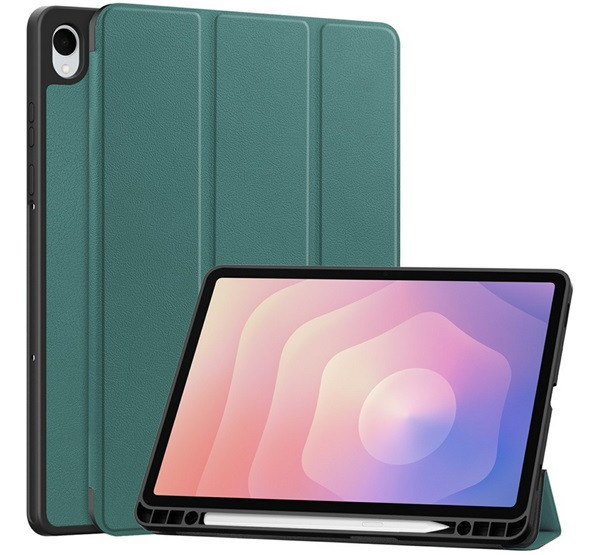 Tok álló, bőr hatású (aktív FLIP, oldalra nyíló, TRIFOLD, asztali tartó, ceruza tartó) SÖTÉTZÖLD