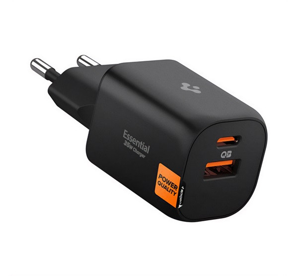 SPIGEN ESSENTIAL EE352EU hálózati töltő USB+Type-C aljzat (35W, GaN, PD gyorstöltő 3.0) FEKETE