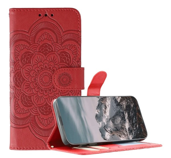 Tok álló, bőr hatású (FLIP, oldalra nyíló, asztali tartó, bankkártya tartó, kézpánt, mandala) PIROS