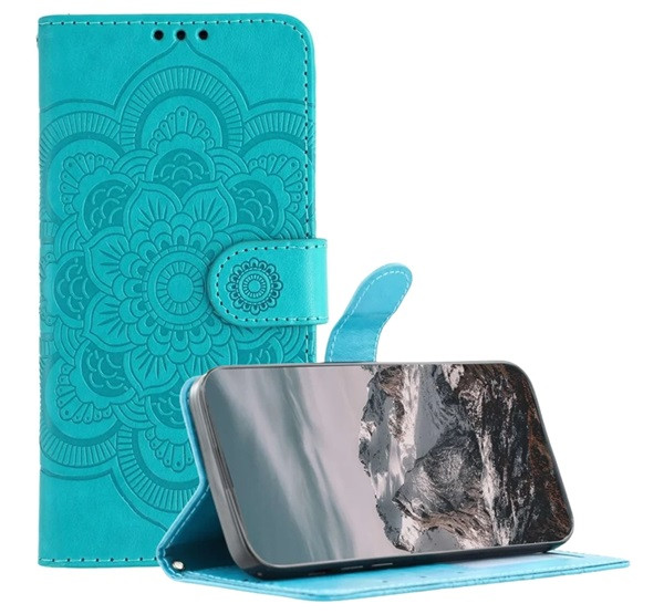 Tok álló, bőr hatású (FLIP, oldalra nyíló, asztali tartó, bankkártya tartó, kézpánt, mandala) VILÁGOSKÉK