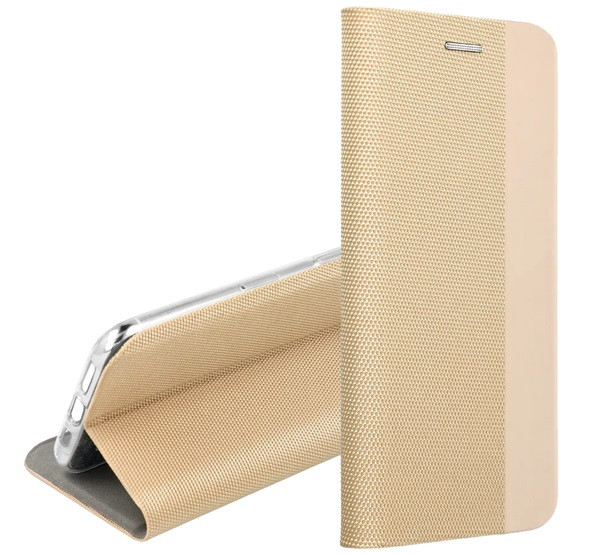Tok álló, bőr hatású (FLIP, oldalra nyíló, asztali tartó, textil minta) ARANY