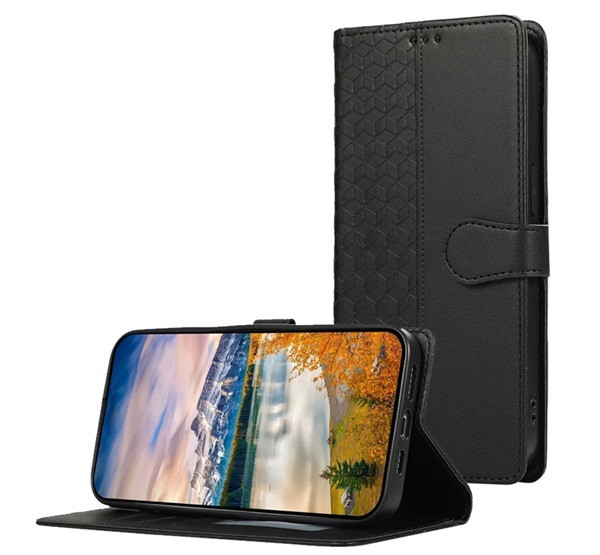 Tok álló, bőr hatású (FLIP, oldalra nyíló, asztali tartó, 3D rombusz, prémium + kézpánt) FEKETE