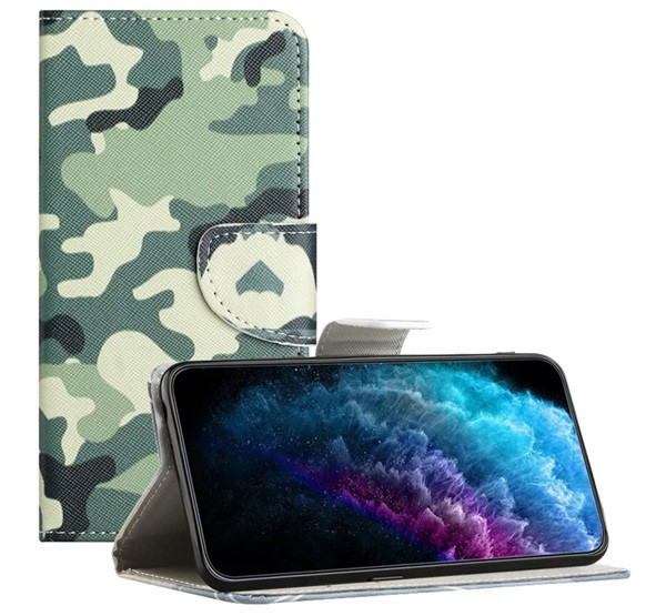 Tok álló, bőr hatású (FLIP, oldalra nyíló, asztali tartó, terep minta) SÖTÉTZÖLD