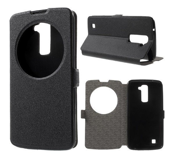 Tok álló, bőr hatású (FLIP, oldalra nyíló, asztali tartó, hivójelzés, ablakos, érdes felület) FEKETE