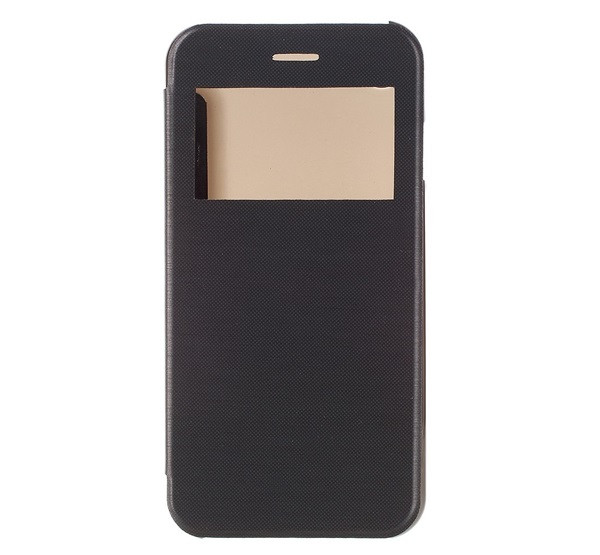 Tok álló, bőr hatású (FLIP, oldalra nyíló, ablakos) FEKETE