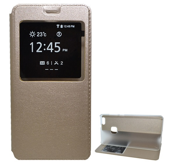 Tok álló, bőr hatású (FLIP, oldalra nyíló, asztali tartó, ablakos) ARANY
