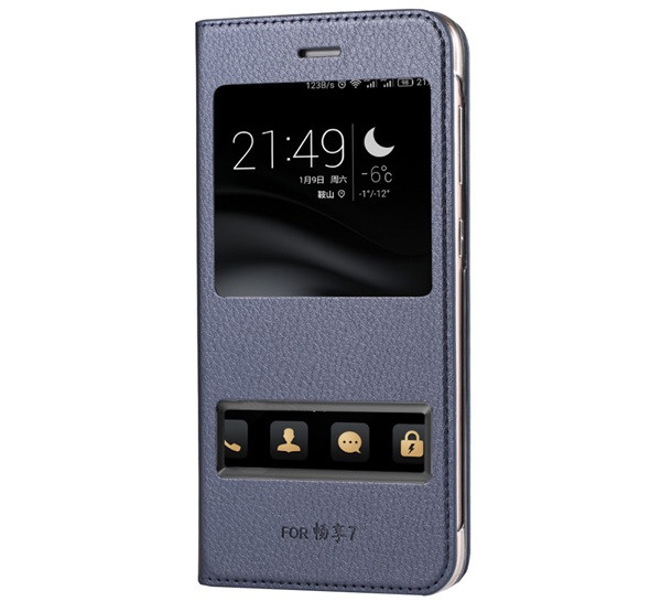Tok álló, bőr hatású (FLIP, oldalra nyíló, ablakos) SÖTÉTKÉK
