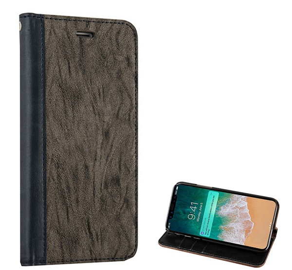 Tok álló, bőr hatású (FLIP, oldalra nyíló, asztali tartó, nyakba akasztható, faerezet minta) SZÜRKE