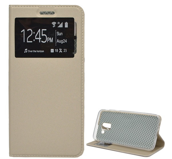 Tok álló, bőr hatású (FLIP, oldalra nyíló, asztali tartó, ablakos) ARANY