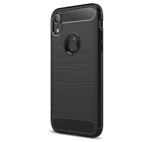 Szilikon telefonvédő (ütésállóság, légpárnás sarok, szálcsiszolt, karbon minta, logó kivágás) FEKETE