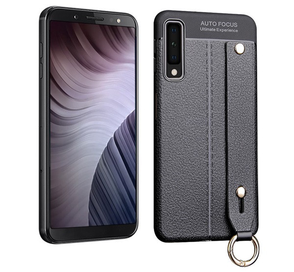 Szilikon telefonvédő (ütésállóság, asztali tartó, bőr hatású, varrás minta + kézpánt) FEKETE