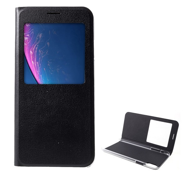 Tok álló, bőr hatású (FLIP, oldalra nyíló, asztali tartó, ablakos) FEKETE
