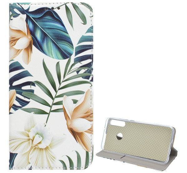 Tok álló, bőr hatású (FLIP, oldalra nyíló, asztali tartó, színes virág) FEHÉR