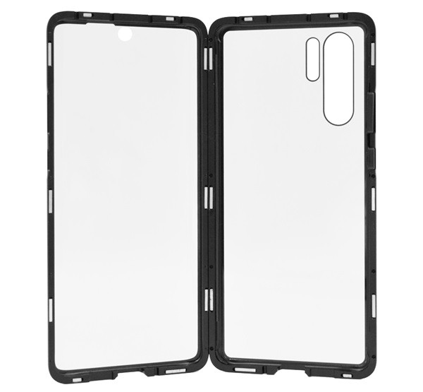 Alumínium telefonvédő (360°-os védelem, mágneses, ütésállóság, üveg előlap + hátlap, 9H) FEKETE